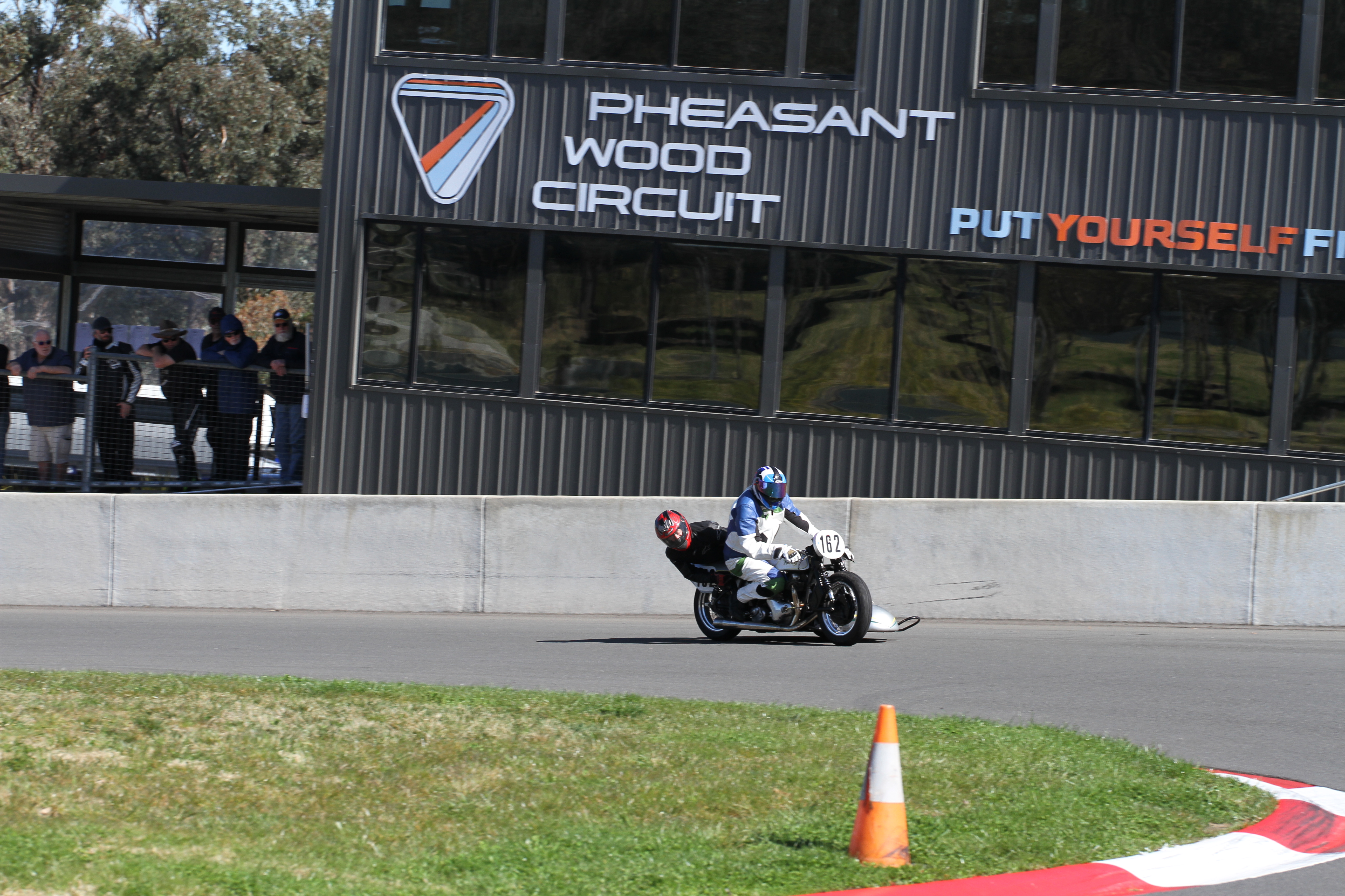 “My weekend at Pheasant Wood was nothing less than thoroughly enjoyable, the weather on Saturday was icky but made for exciting racing on the sidecar. We were fortunate enough to have two wins from two races on Saturday, but alas on Sunday we were leading out third race quite comfortably and then drama struck on lap four which forced us to retire with a DNF. Then panic set in chasing the problem which was well hidden but with many eyes on the case (a special thanks to Charlie Geanellous) we found the problem. Then the pressure was on Rodney Anshaw to resolve said problem in time before our next race, which was the handicap event that we wanted most – to chase down our rivals, but despite all of Rodney’s best efforts to adapt a foreign set of points we missed our race. Not to be deterred though he persisted, and we got the old girl running, albeit on one cylinder, so he took young Kayla out in the last to have some fun and support the event, knowing a place in the top three was completely out of the question.