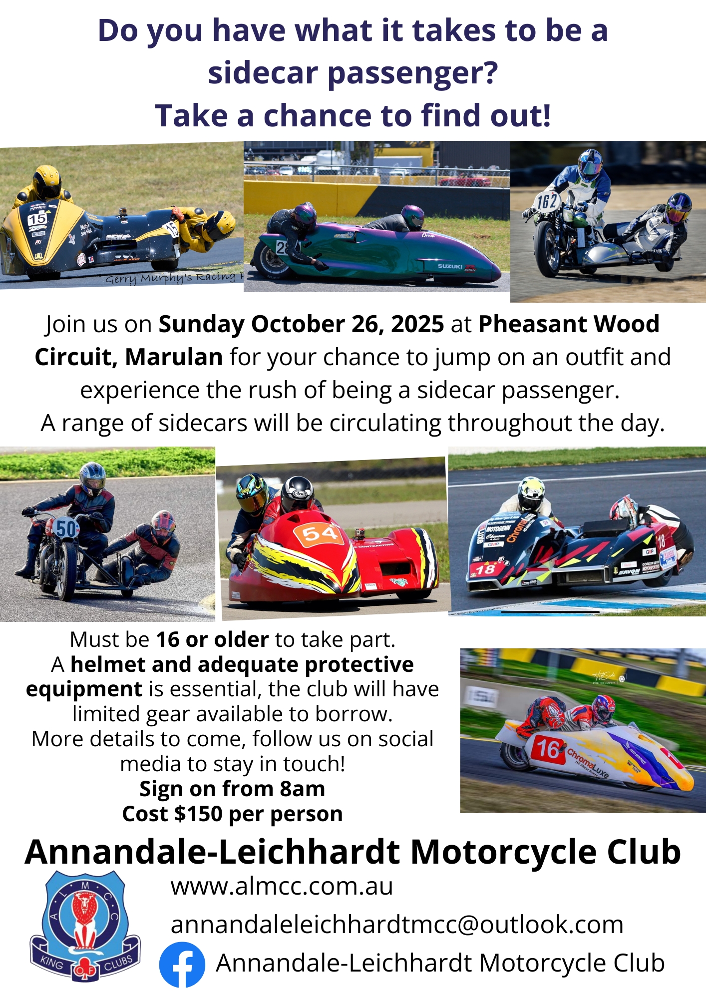 The day is a perfect opportunity for people to give being a sidecar passenger a go. We will post more information over the coming months about what is involved, but for now make sure you have the day locked in.